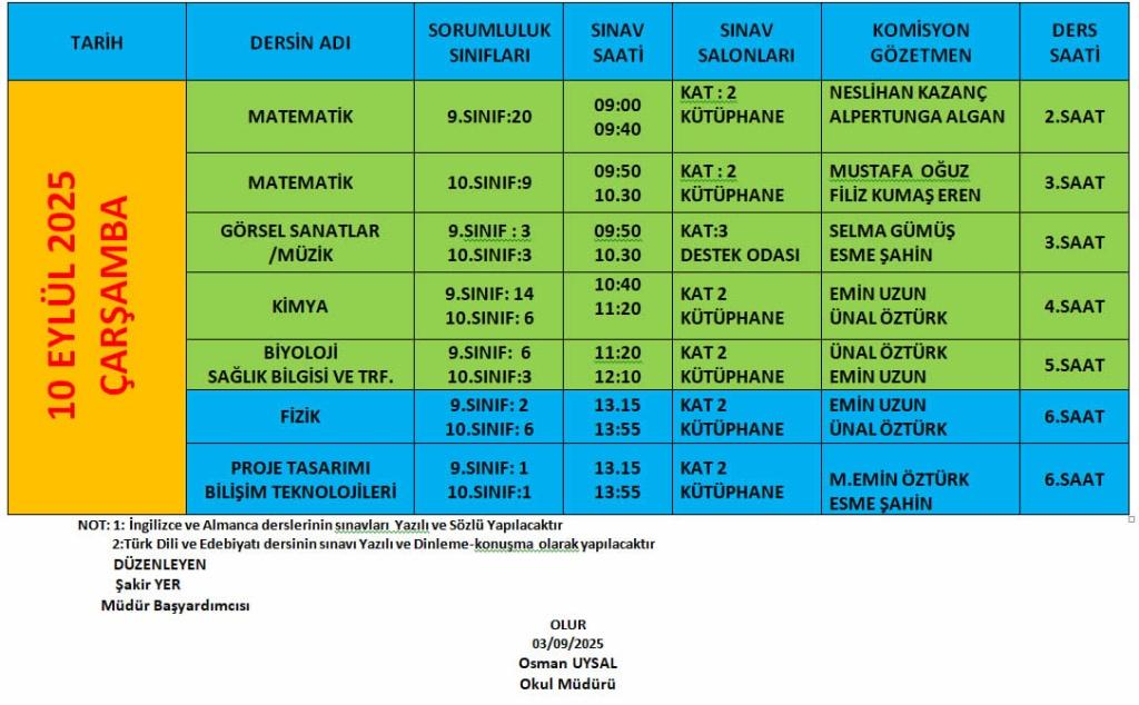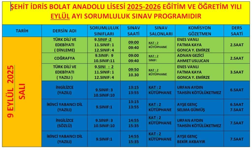 EYLÜL AYI SORUMLULUK SINAV PROGRAMI
